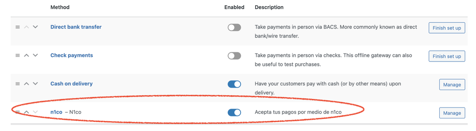 disponibles. Activa "n1co" para habilitar la Pasarela de Pago n1co.