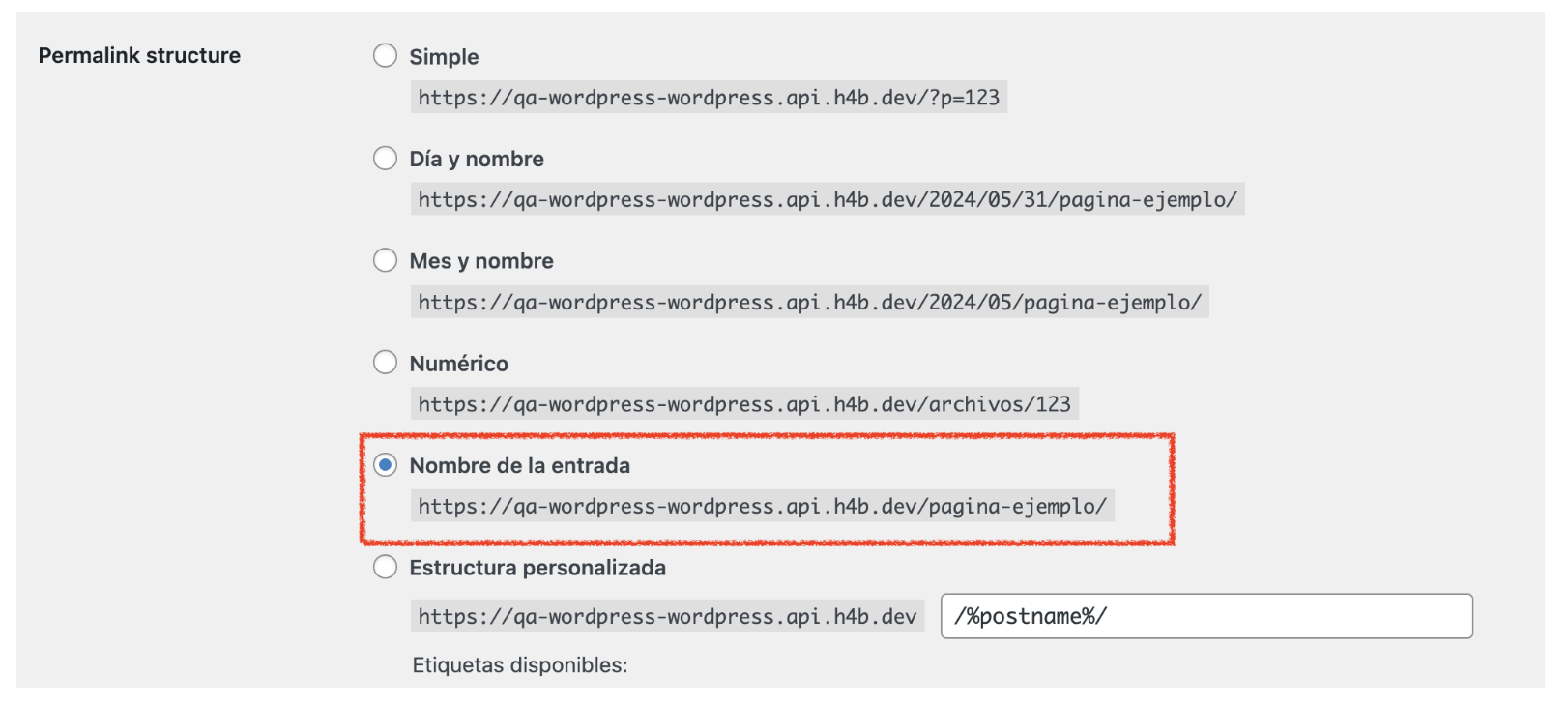 - Para el correcto funcionamiento del webhook es necesario configurar Ajustes->Enlaces Permanente como “Nombre de la entradaˮ