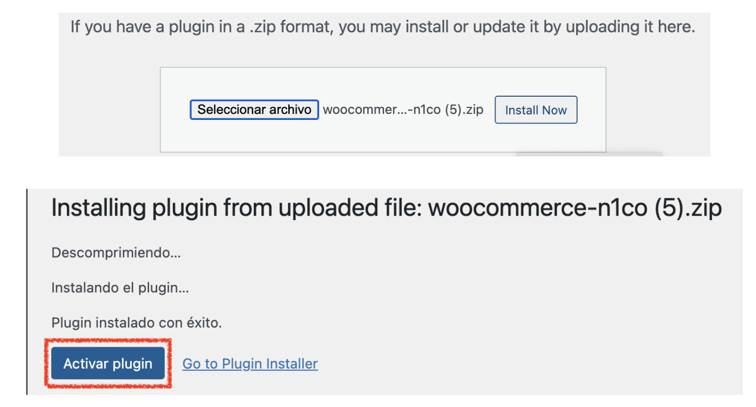- Descarga el plugin de la Pasarela de Pago n1co desde nuestro sitio web o el repositorio de plugins de WordPress.